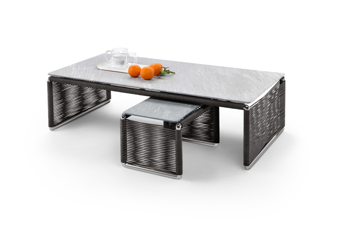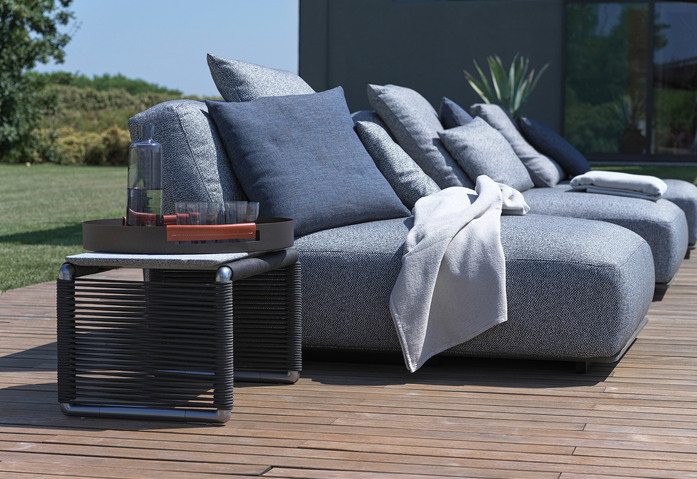 Hand-woven by expert artisans, the upholstery lends welcoming warmth to the metal, making Tindari an object with unmistakable personality that can easily be combined with any of the chairs in the Flexform outdoor collection to furnish porches, decks and patios with style and elegance. Tindari coffee tables also come in a version with the top in Beola argentata (slivery green gneiss), lava stone, porphyry or pietra del Cardoso.