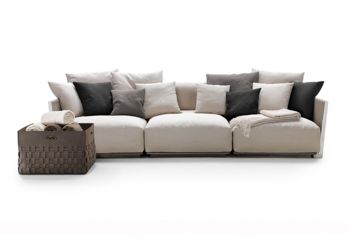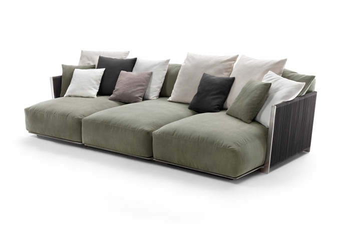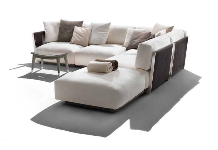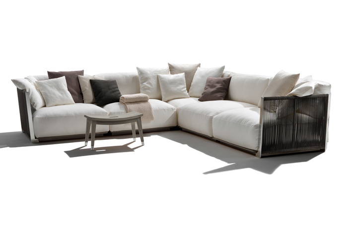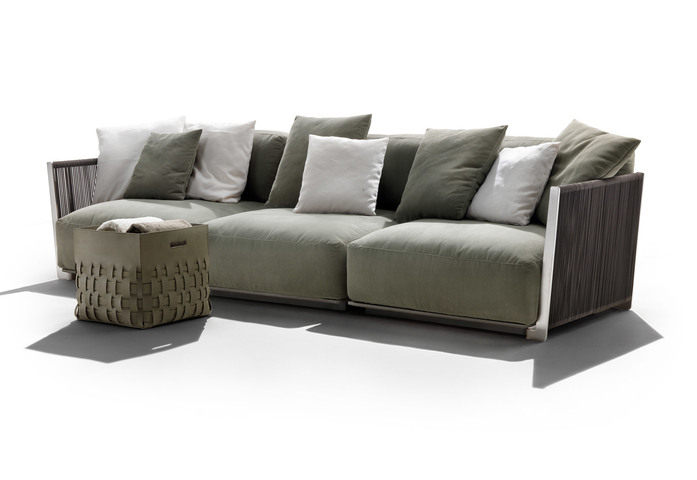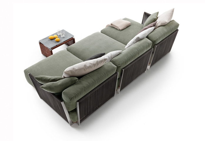 The woven pattern especially dear to Flexform has inspired many products in the indoor collection, and it is now the distinctive motif in the Vulcano seating system. Features that are part of its DNA, like compositional flexibility and a high degree of customization, coupled with a determination to find just the right materials to ensure optimum performance outdoors, form the core design elements of the Vulcano sofa. The sofa base is made of marine plywood, while the armrest and backrest structures are in austenitic stainless steel 316, a super alloy that ensures superior performance in outdoor settings.