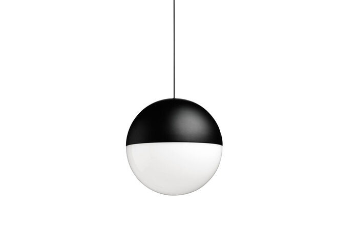 Suspension lamp providing diffused light. Matt black varnished die-cast aluminium body coated with clear soft-touch varnish. Optical diffuser in opal PC. Suspension system of 22 metres with Kevlar reinforced coaxial cable. Available with wall/ceiling connection in black PC and power suppy with floor switch in matt black varnished PC. The on/off switch is electronic with optical mechanism. on/off and dimmer operated by means of available for Android and Apple remote control application.