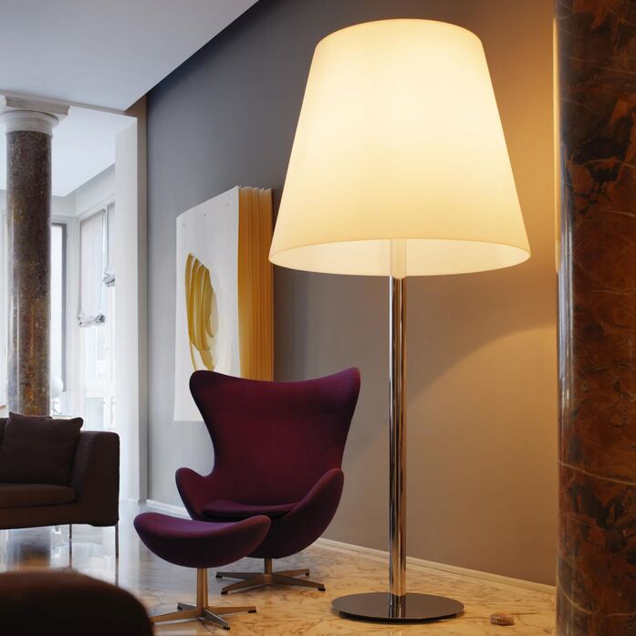 Floor lamp. Its size fits it for wide public and private spaces. Mounting in chrome-plated metal. Diffuser in polyethylene white colour. Transparent electric cable, dimmer and plug.