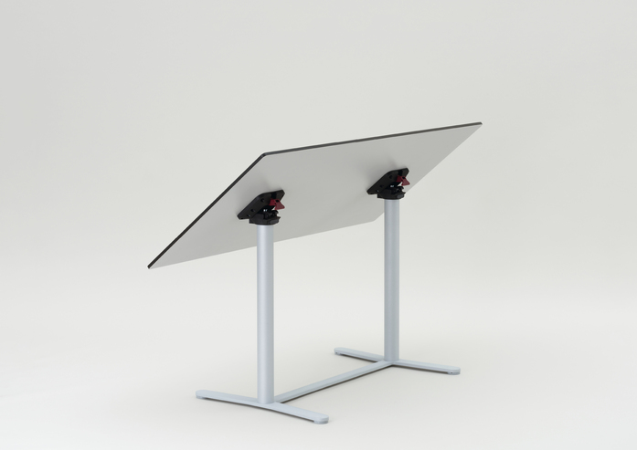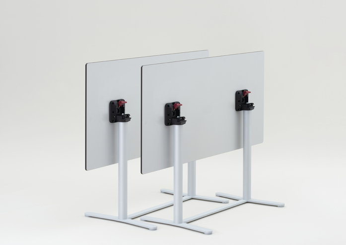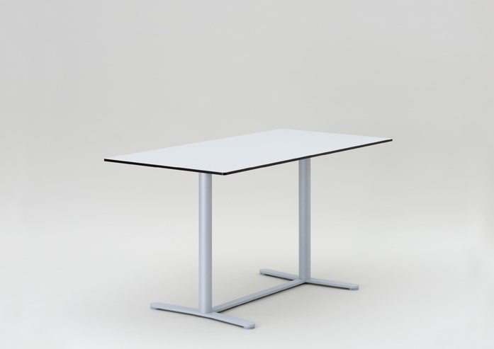 A double column table with an elegant double-T-shaped stand with a traverse instead of the typical large disk stand – complementary to the FIX_UP/UP_DOWN table series and equipped with height adjustable gliders (FORMvorRAT System). Applicable as a small conference table or for gastronomy, hotel, or contract furnishing.