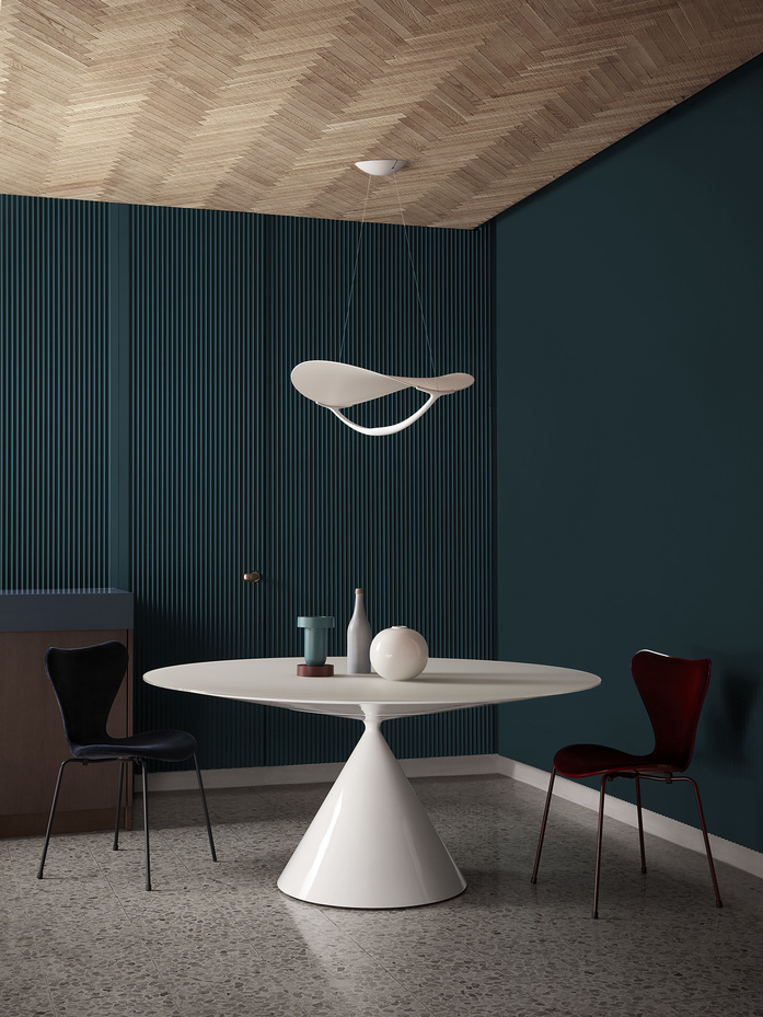 Plena takes its name from the full moon, the form of a light that makes people fall in love. Large in size but light and dynamic, Plena provides dual lighting: reflected on the surface below it, and spreading towards the ceiling. An intriguing light, of special charm, to completely permeate a room while remaining soft and enveloping.