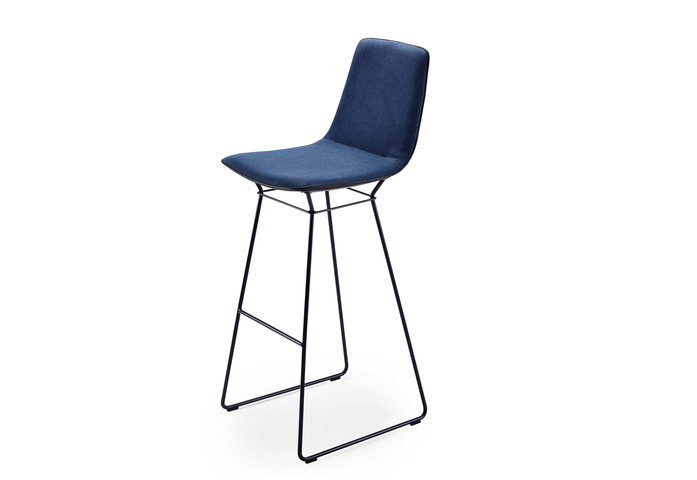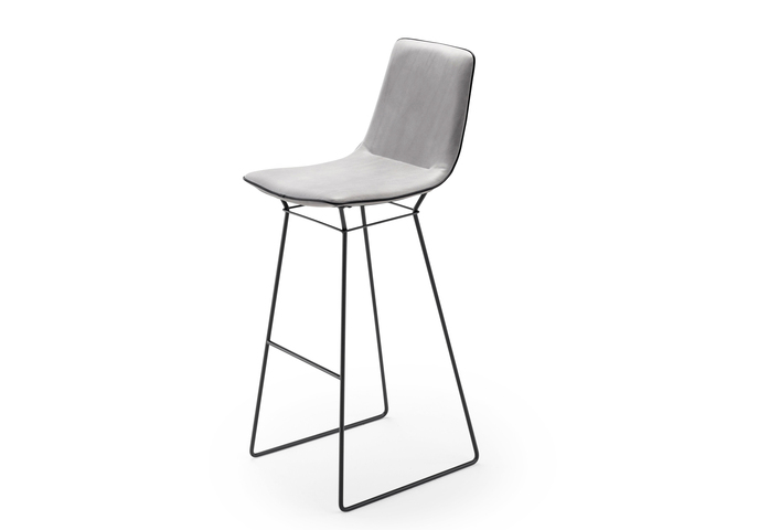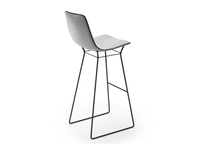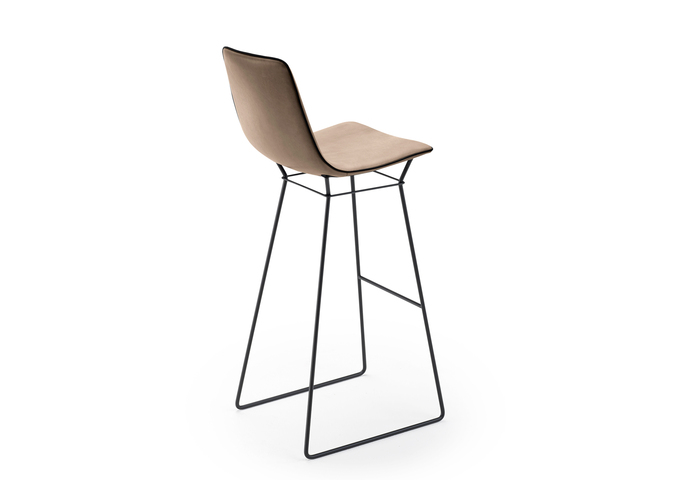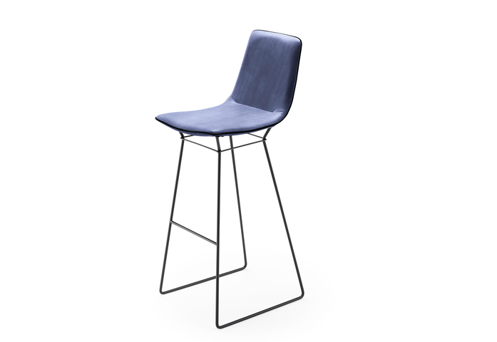 In the basic version, the piping accentuates the shape of the seat shell. The chair is also available with stitching in the lumbar area or in leather which is pulled taut at the back and fastened with a leather loop. The standard version of the frame is available in different kinds of solid wood, in coloured powder-coated steel or even stainless steel (brushed or polished).