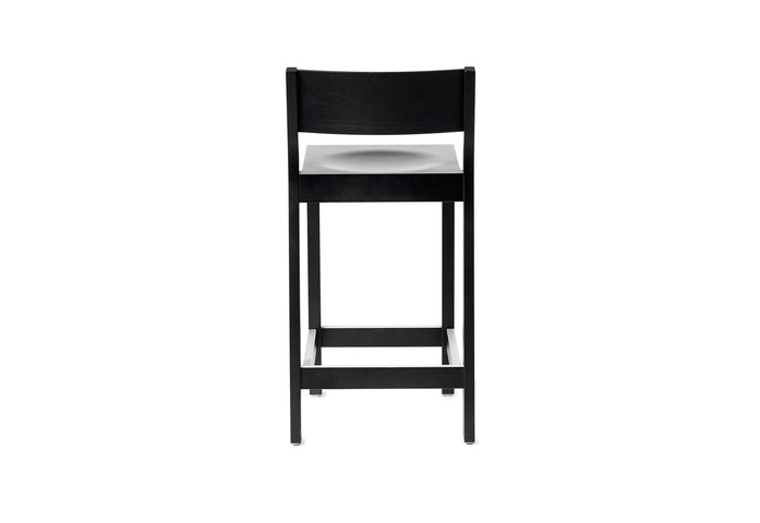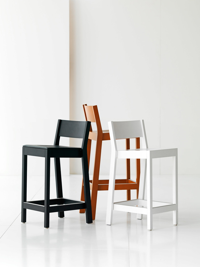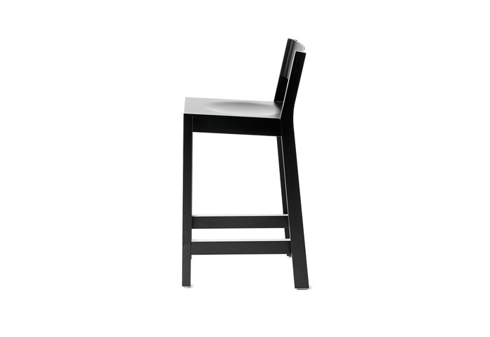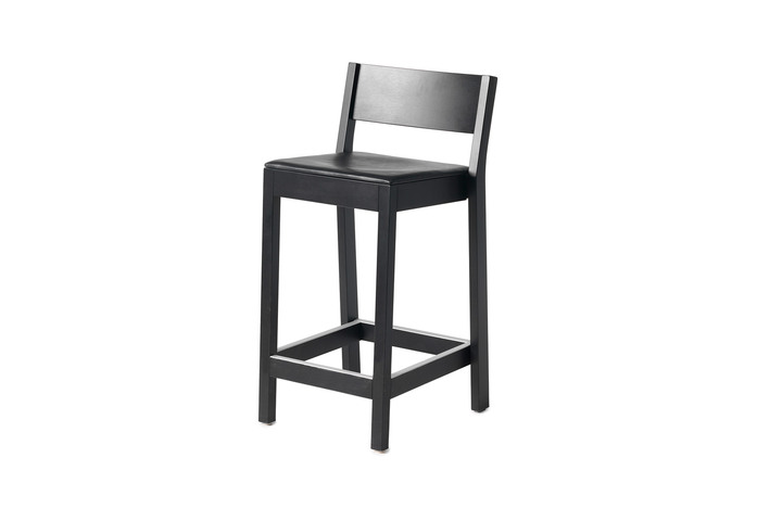 Bar stool in natural birch or ash. Sound absorbing and environmentally friendly sound felt under the seat covered by perforated plywood.Seat in veneer or upholstered in fabric or leather. Felt glides. Two seat heights 650/ 780 mm. Metal coated footrest. Approved by Möbelfakta – quality, environment and social responsibility, certificate no. 220130909.
