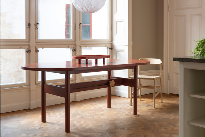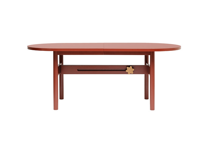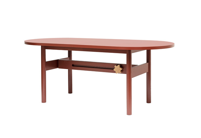 Table with top in oak veneer, table extension. Frame in solid oak. Knob in solid beech.