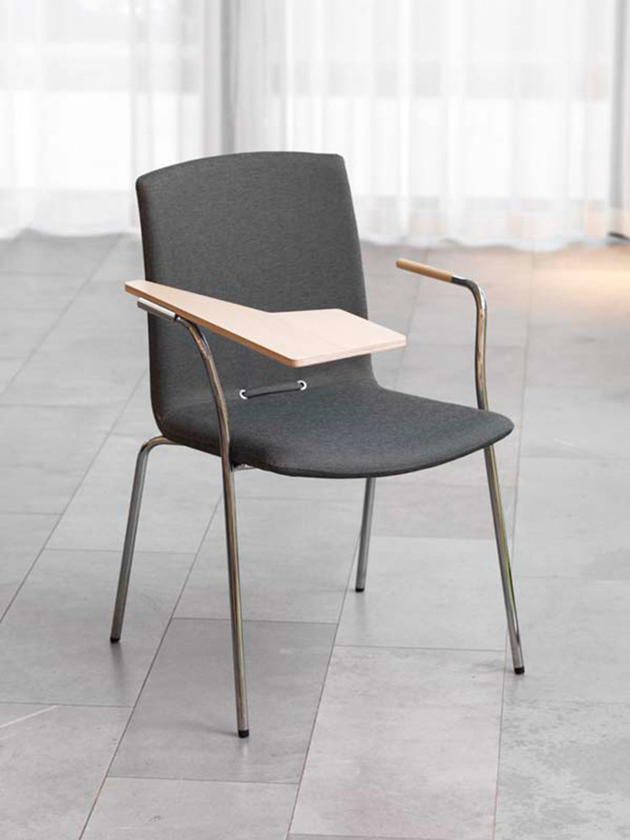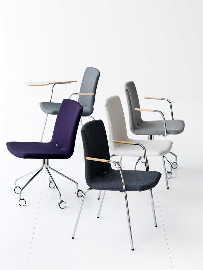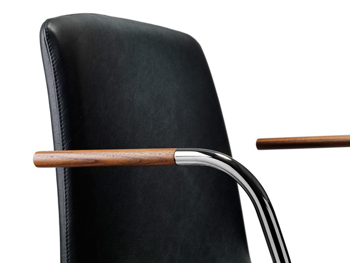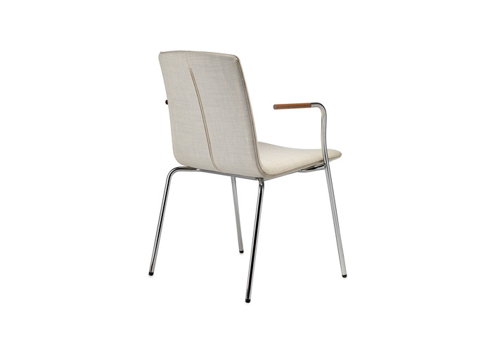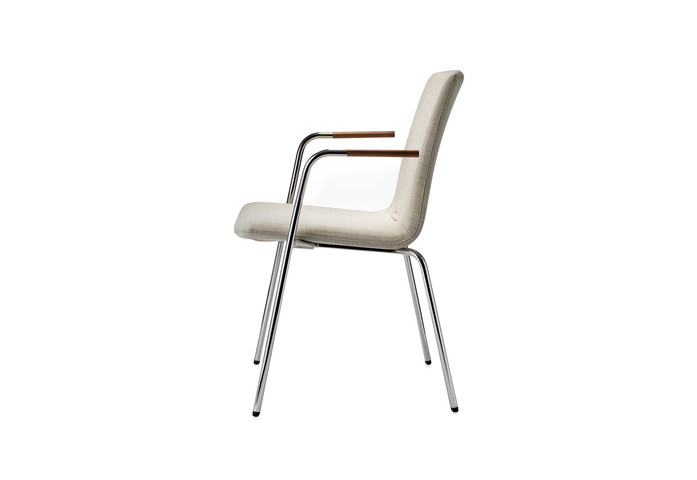 Fully upholstered armchair in fabric or leather with armrests in ash, birch, oak or walnut or stained. Strip in the back can be provided in a different colour or fabric. Replaceable cover. Frame chromed or white lacquered steel (RAL 9003). Stackable and linkable. Felt glides.Approved by Möbelfakta – quality, environment and social responsibility, certificate no. 1520130705.