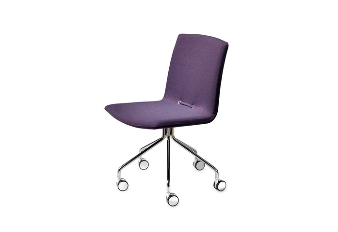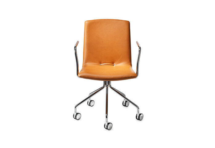 Fully upholstered armchair in fabric or leather with armrests in ash, oak, birch or walnut. Swivelbase in chromed or white lacquered steel (RAL 9003). Available with height adjustable seat 420-490mm. Plastic glides or wheels. Approved by Möbelfakta – quality, environment and social responsibility, certificate no. 0120180411.