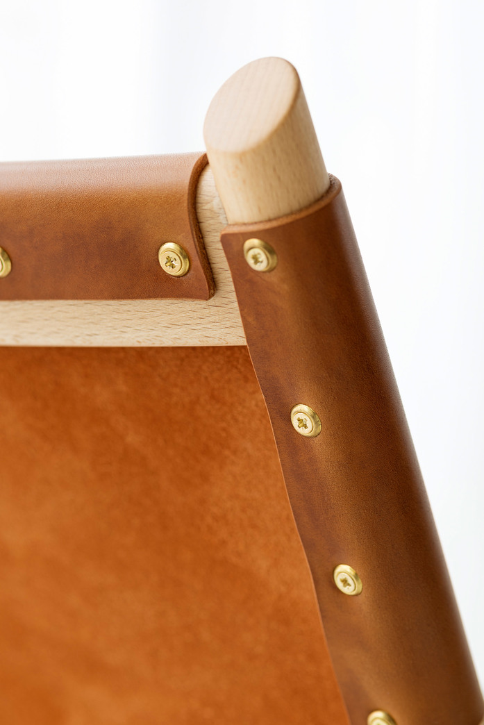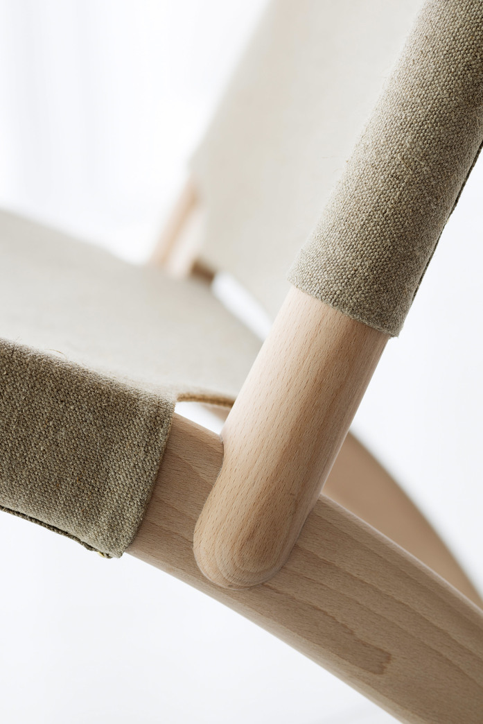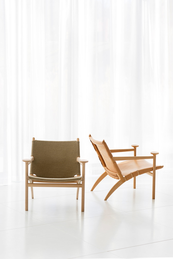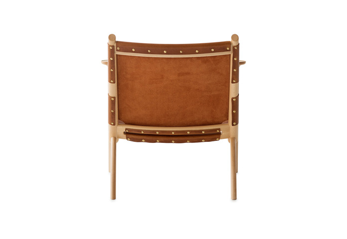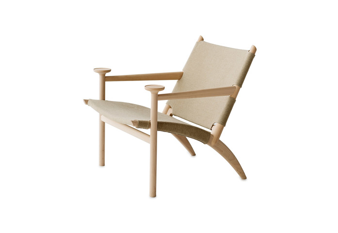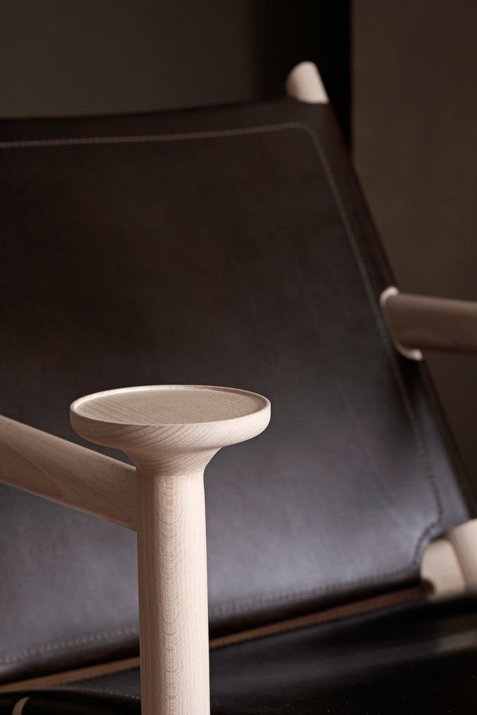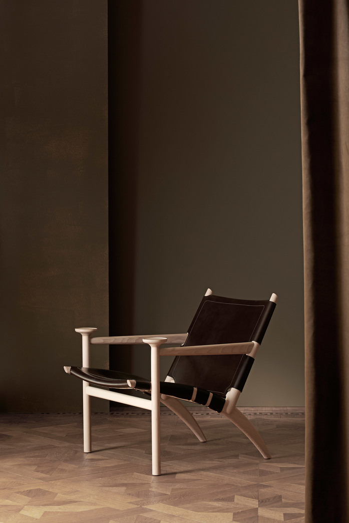 Easy chair with frame in solid white-pigmented waxoiled beech. Seat and back either covered with vegetabilic tanned Tärnsjöleather in color; natural 9200, black 9204, cognac 9203 or brown 9208, or in natural linen. Available with seat- and back cushion. (Leather for cushion; Tärnsjö 8805 natural, 8175 black, 8695 cognac, 8678 dark brown.) Plastic glides.