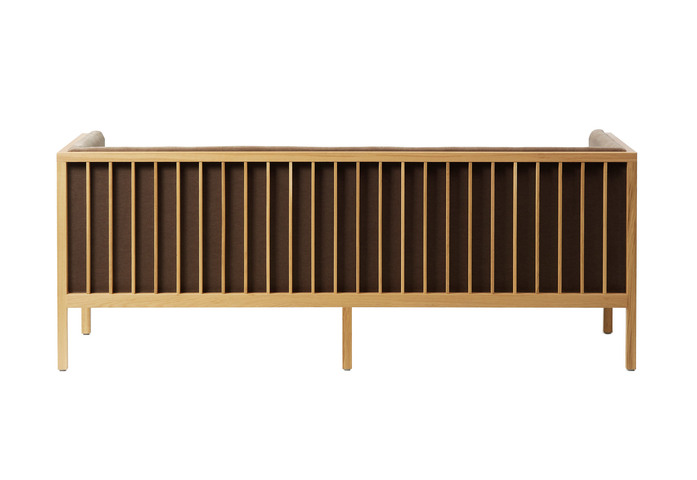 Sofa 2- or 3-seat, frame in natural oak. Upholstered in fabric or leather. Plastic glides.