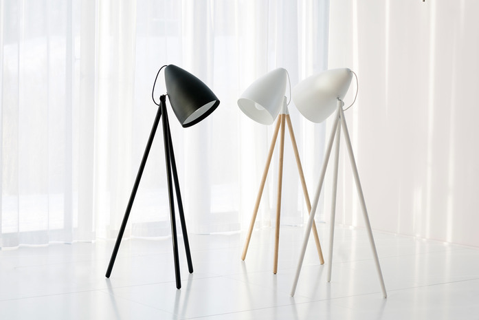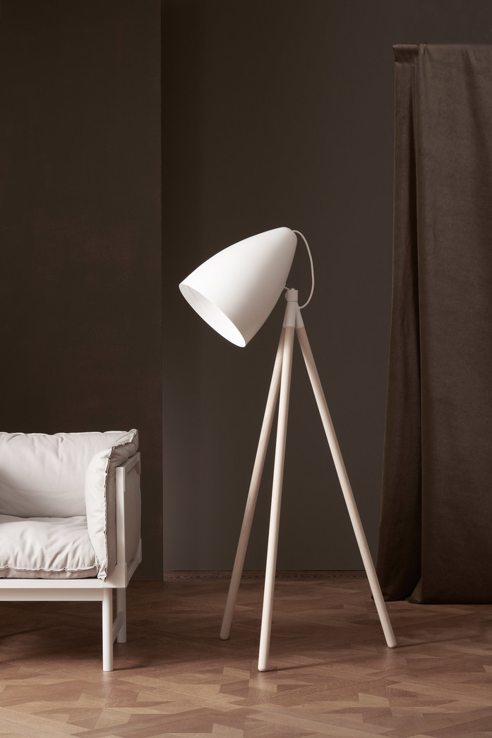 Floor lamp, legs in natural ash. Lampshade in black or white lacquer. Classifications for the European market. Bulb Philips LED Globe, E27 fitting, 9,5W (60W) 2700K.