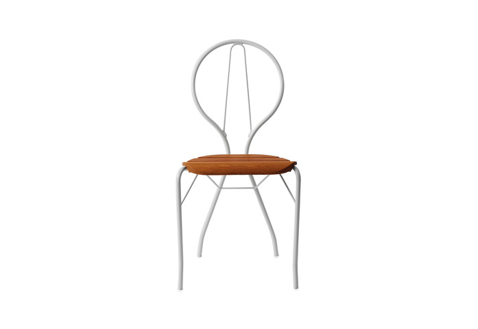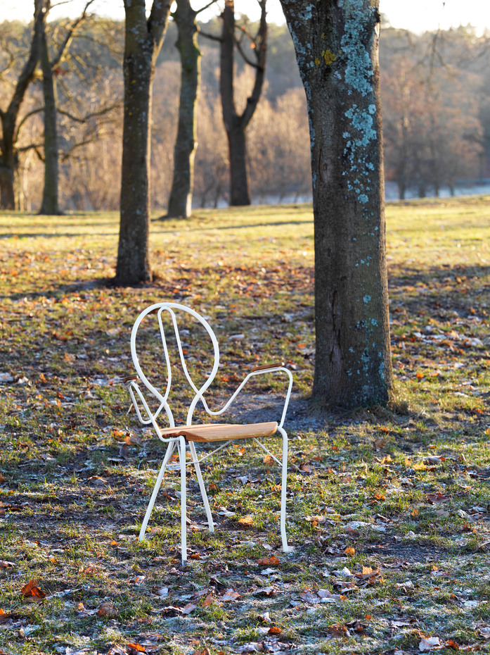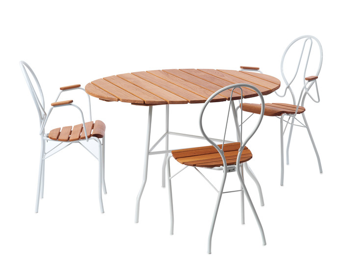 Chair/armchair/table in white lacquered or galvanized steel. Seat, armrests and tabletop in solid oiled oak.
