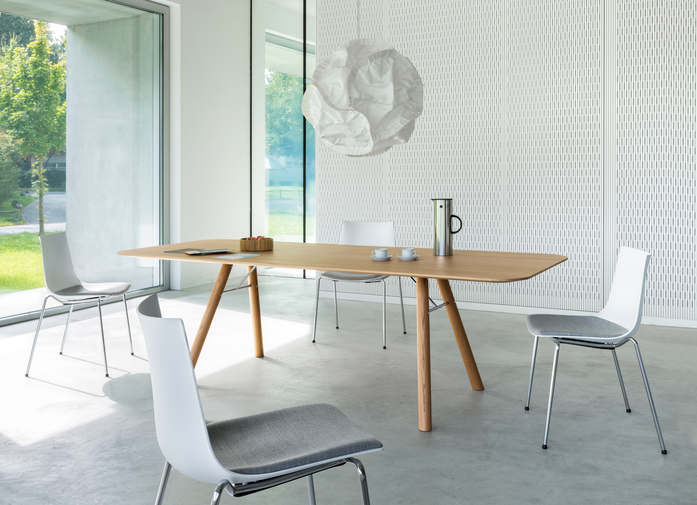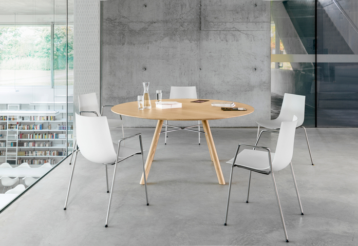 As well as being aesthetically appealing, the "Akio" table range also scores highly in terms of sustainability. The wood is from managed European forests and is bought and stored in Girsberger's own wood trading business according to the highest quality standards. There is no impact whatsoever on the environment during the production of this range and it is 100% recyclable.
