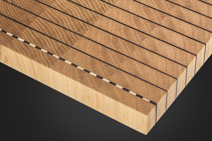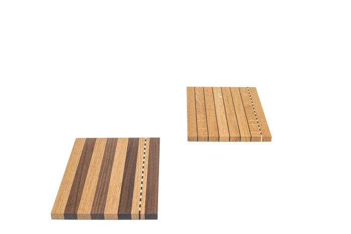 All the accessories are available in both the "Linea" and "Contrast" designs. The Linea collection primarily features the lighter oak wood, interspersed with thin strips of the striking dark walnut, while the Contrast collection combines oak and walnut segments of equal thickness to great effect. Both collections feature decorative straight-line designs.