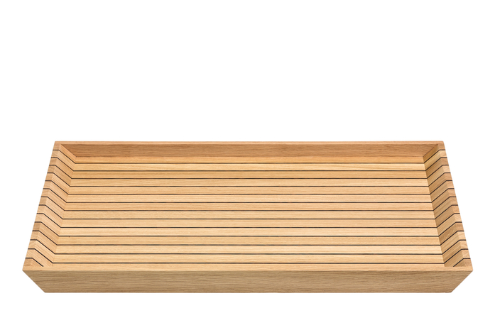 All the accessories are available in both the "Linea" and "Contrast" designs. The Linea collection primarily features the lighter oak wood, interspersed with thin strips of the striking dark walnut, while the Contrast collection combines oak and walnut segments of equal thickness to great effect. Both collections feature decorative straight-line designs.