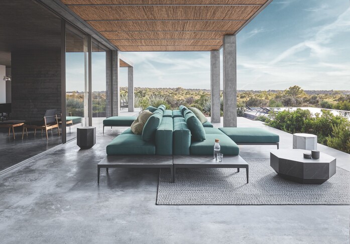 The generously padded outdoor cushions are made of weatherproof material that can withstand all seasons and are available in various colours. Matching side tables and coffee tables with ceramic or polished teak tops underline the elegant and simple character of Grid.