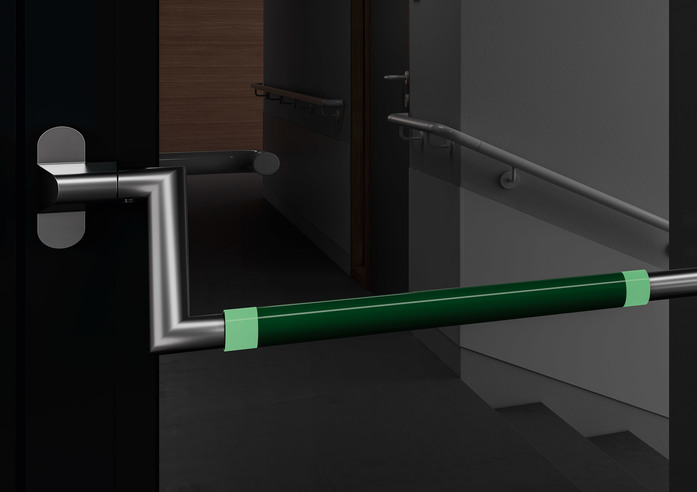Version for BKS-locks. Handle made of stainless steel, diameter 25 mm with tubular handle made of polyamide, diameter 30 mm. 20 mm wide luminescent rings on the two outer sides for orientation in case of light failure. Handle tube positioned as one-sided handle, therefore clear visualisation of the optimum pressure point on the lock side, conforms to the requirements of DIN 18040. The stainless steel tubes are connected by a square bar - telescopic. Low projection depending on the operating angle of the lock follower, but at least in accordance with DIN 1125, grade 2: <= 100 mm.
