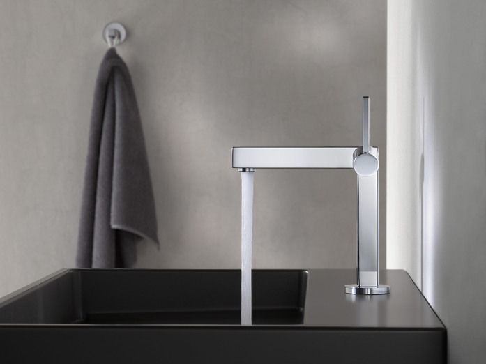 The design of KEUCO's EDITION 90 fittings uses a language that is clear and consistent. The visual statement of the design is consistently “square on round”. The design of the fittings is marked by precise contours and brilliant chrome surfaces. A range of fittings is available which includes a single-lever mixer for the washbasin, a wall spout fitting in various sizes, and a three-hole basin mixer. In-wall thermostat solutions are available for up to three users for the shower and bath tub. An elegant free-standing fitting for free-standing bath tubs, with a remarkably luxurious exterior that houses some very special technical features is included in the collection: The functionality for switching from the bath tub fitting to the hand shower is integrated in the fitting, so it can be conveniently switched with a simple hand movement. In a vertical position the fitting lever is set to “off”. When in the back position the water flow is always switched to 100% to fill the bath. The further the lever is moved back, the hotter the water gets. Moving the lever forward regulates the water flow through the round pencil hand shower. Here the temperature and amount of water are controlled the same way as a conventional single-lever mixer.