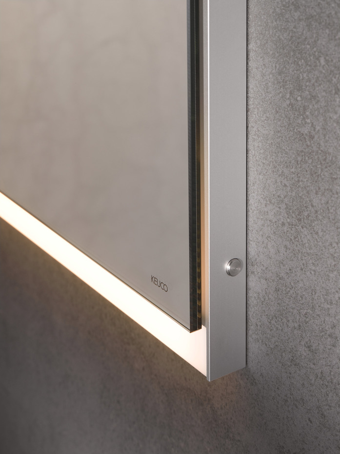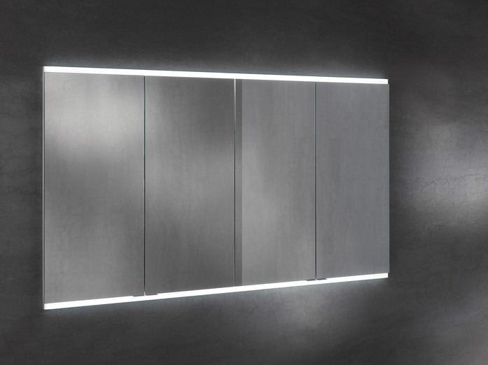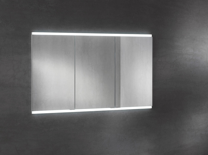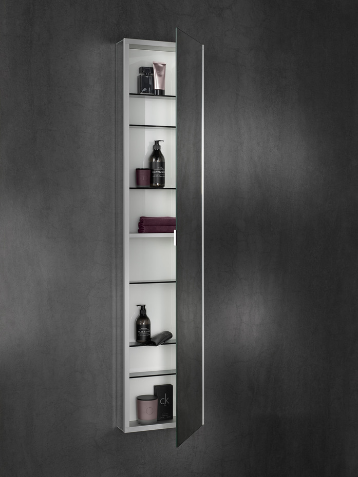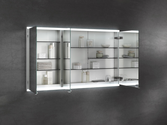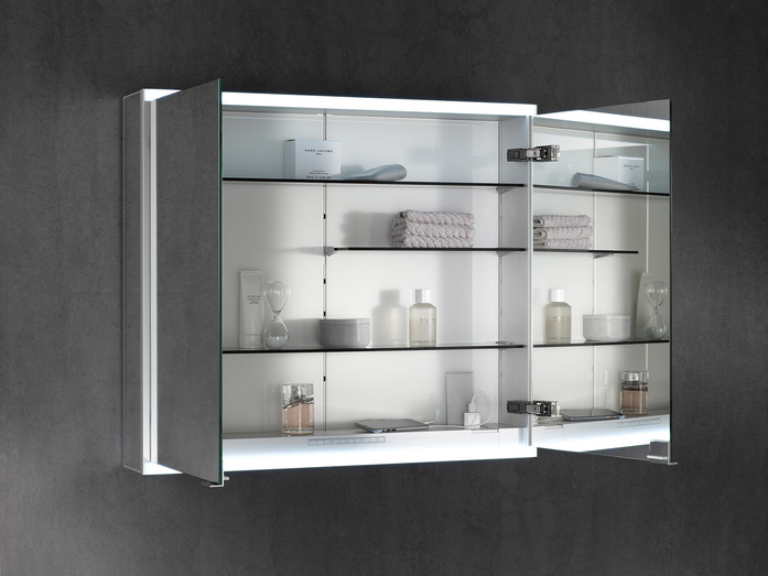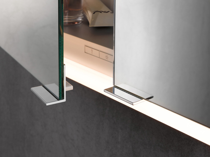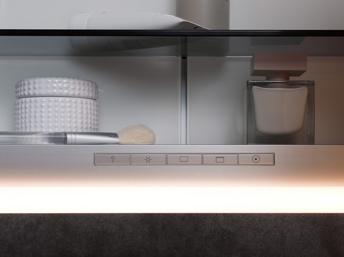 The horizontal LED lights at the top and bottom ensure shadow-free, glare-free and strong illumination of the face. But they also masterfully highlight the wash area. The light can be finely adjusted in brightness and light colour to suit the needs of its present user: It can be changed in an infinite number of steps ranging from bright daylight-white light for day-to-day beauty care, right to a dimmed warm-white light for relaxing. The sensors light controls are situated in the interior of the mirror cabinet therefore preserving the reduced and tidy appearance of the exterior. Hardly visible on the outside there is a small button for switching it on and off. There is even a version of the mirror cabinet without lights, if no light is preferred!