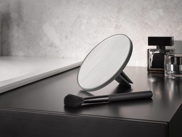 The interior of the ROYAL MODULAR 2.0 will surprise you with its high-contrast and luxurious design, featuring tinted glass shelves which can be arranged to suit your preferences, and a rear wall of white glass. Pivoting doors with mirrors on both sides offer a generous all-round view. The exclusive “soft-close” technology ensures that they close very gently, and can also be adapted on the black hinges to close slower or faster according to your liking. One very practical feature is the cosmetic mirror, which can be flexibly attached to the glass shelves and doors or can also be placed on a surface. A magnetic strip helps making it easy to find small beauty accessories. Further special features are the power socket options and the double USB connection, which are concealed behind two flaps.