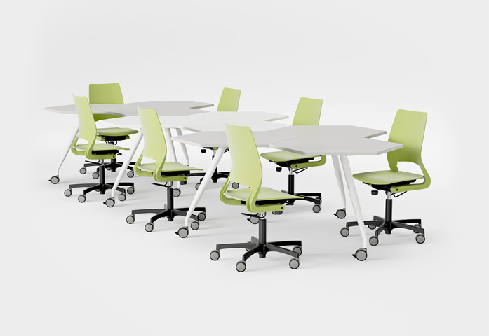 Trixagon is a puzzle that can quickly be rearranged to accommodate your changing needs. At the centre are the hexagonal tables that can be used for individual or group work, training, schooling and as conference tables. The tables can be linked in a number of constellations, from group tables to long tables. They are equipped with easy-to-roll and lockable castors, making it easy to refurnish. They can be further equipped with electrical sockets for equipment and charging and are prefect for project work, group presentations and video conferencing.