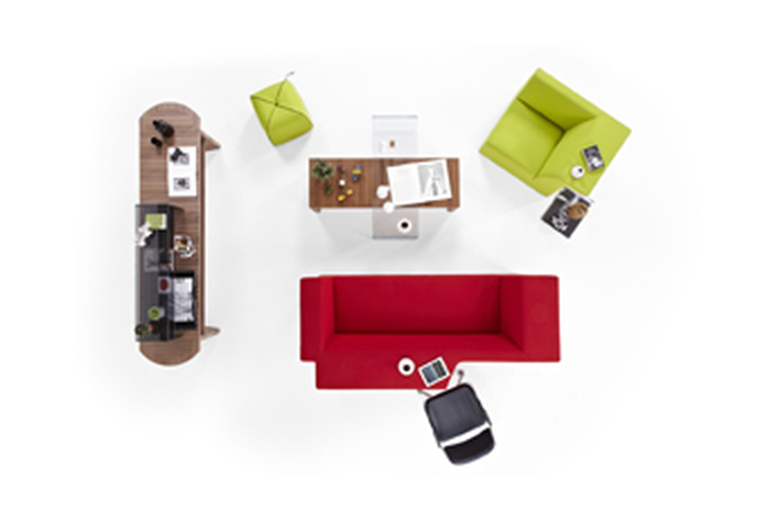 Ikaros, designed by Koray Malhan, is a sofa as an alternative to a desk and to serve the needs of any work environment. The design can be placed in the middle of any work zone or at confluence areas to bring people together for chance or formal encounters, or to enhance cross fertilization of ideas and discussions in a work area. This design combines work with pleasure and relaxation, with the sofa doubling as a writing tablet and a table at the same time. All horizontal surfaces may be used as service areas. The extension wing in the rear is at table height, where it can be used as a worktop whilst sitting on a chair. This feature allows the seating unit to be used simultaneously from inside and outside, providing the users with a collaborative use for more casual work.