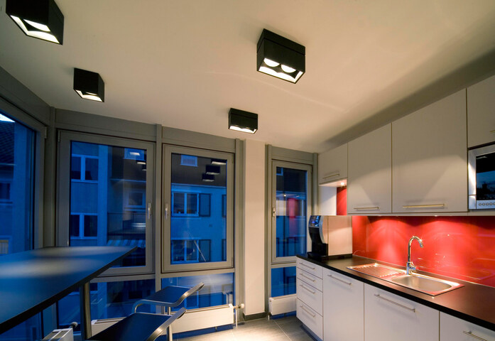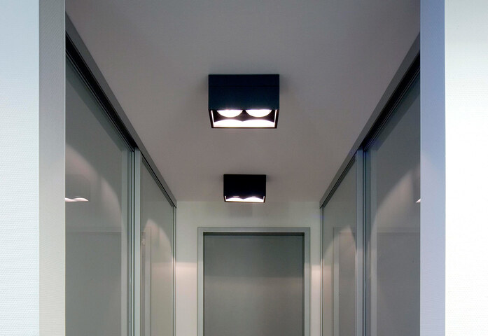 kreon prologe wants to create functional light through the discreet presence of simple architectural volumes and adds fixed and directional LED lightsources in a surface mounted box. kreon prologe in-line and kreon prologe in-dolma give light mass, depth and form. Recessed in a ceiling, it sculpts architecture. Openings are made in the plastered surfaces using prefabricated anodised aluminium profiles that support the kreon prologe elements. The profiles, measure-made, are pre-cabled and realized according to your lighting design. The standard fitting is made of black or white powder coated steel.
