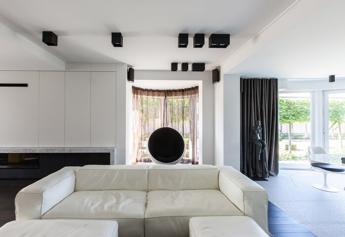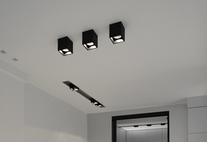 kreon prologe wants to create functional light through the discreet presence of simple architectural volumes and adds fixed and directional LED lightsources in a surface mounted box. kreon prologe in-line and kreon prologe in-dolma give light mass, depth and form. Recessed in a ceiling, it sculpts architecture. Openings are made in the plastered surfaces using prefabricated anodised aluminium profiles that support the kreon prologe elements. The profiles, measure-made, are pre-cabled and realized according to your lighting design. The standard fitting is made of black or white powder coated steel.
