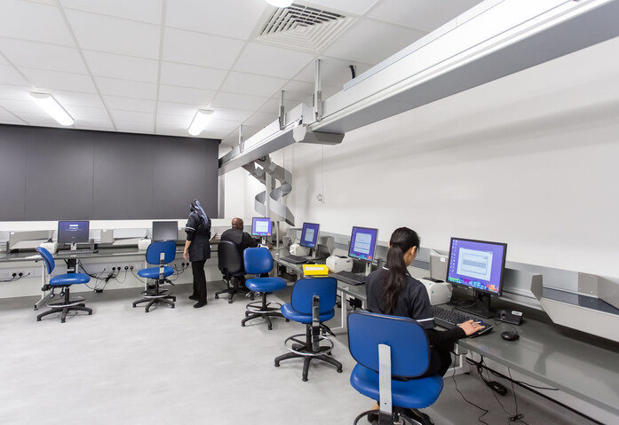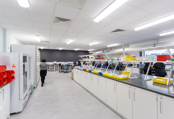 The IBI Group architecture studio and construction company Kier Construction (Western and Wales), relied on the KRION® transformation company Medspace Solutions for the manufacture of the island treatment countertop and the perimeter support tables from 6905 Ash Grey colour KRION.