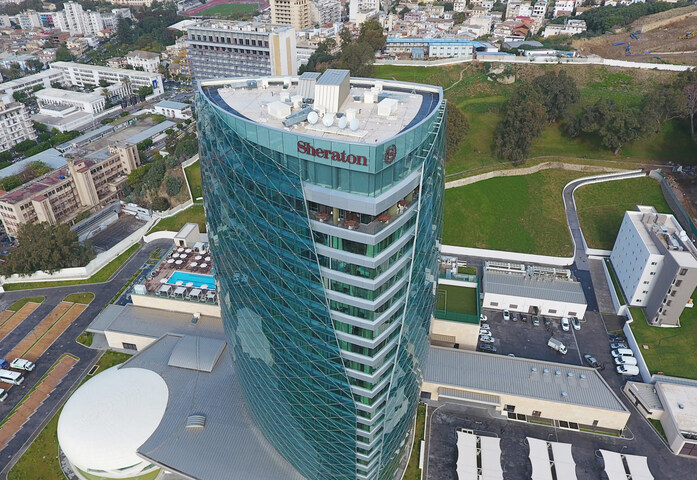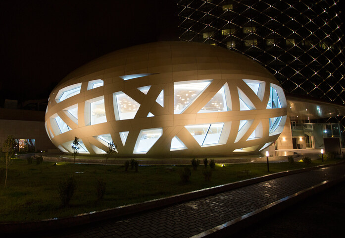 Initially, work began on a symmetrical spherical body without openings on the exterior, which then had to be altered to achieve perfect harmony with the main tower of Hotel Sheraton Annaba. In this way, the outer dome was made with a circular plane and symmetrical in three dimensions. The next step was to attach it to the canopy of the hotel, which required making it asymmetrical. Finally, the internal part had to be developed; to do so the architect decided to make openings to the exterior, following the path of the predominant ramp in the internal structure.