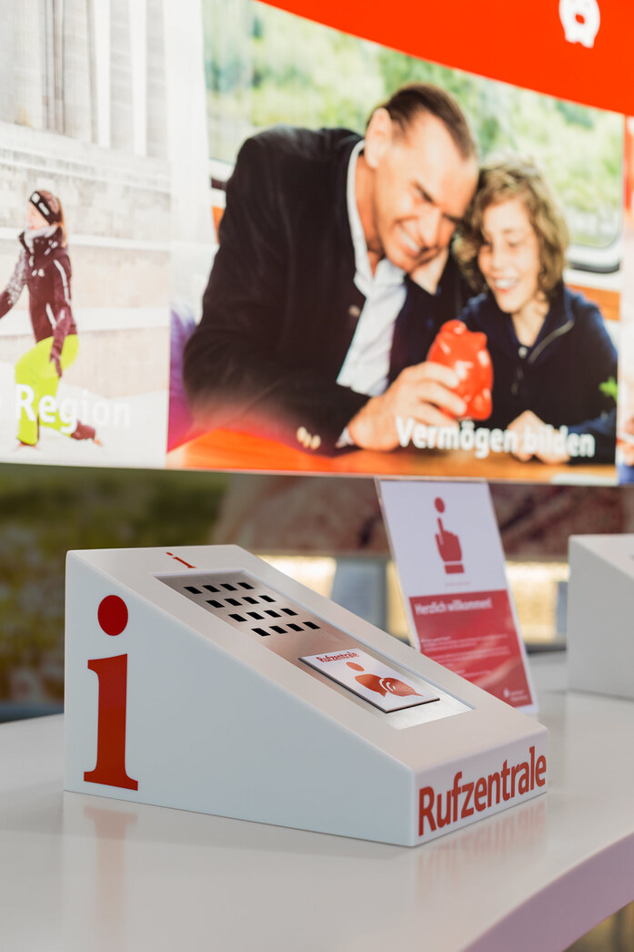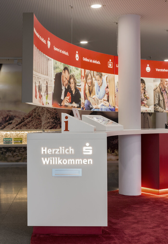 We can find KRION in colours 6501 Cream and 6401 Red Fire, perfectly combined with the corporate colours of Sparkasse. The commercial units of this project have been perfectly combined with both colours to create the curved information point which incorporates screen supports and backlighting created with KRION 6501 Cream. The 6401 Red Fire colour provides the corporate colour, used as a base for the bench, support and drawer unit. In the rear section next to the wall, we find a shelf, incorporating windows, created with 6501 Cream, used to present awards and certifications granted to Sparkasse.