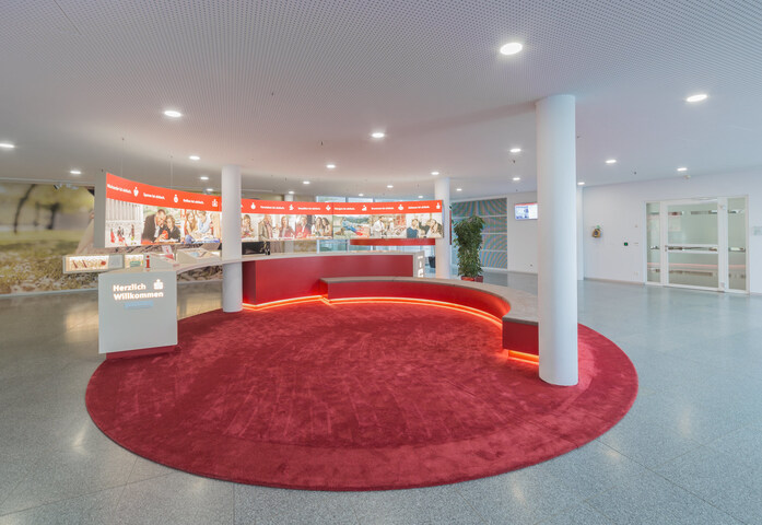 In the case we are looking at, the lobby of Sparkasse Central (Regensburg, Germany) was originally planned as a reception with customer service personnel, but was ultimately converted into an information area for clients who could register on a display upon arrival, and find out about new Sparkasse products. This is how the idea arose to create an Information ARENA which would use the circular shape of the premises. The solid surface from PORCELANOSA Group, KRION, was chosen by architects K R A N Z Das moderne Büro GmbH and designers Hornburg und Thumann GbR, thanks to its resistance, durability and quality, characteristics which represent the essential values of Sparkasse.