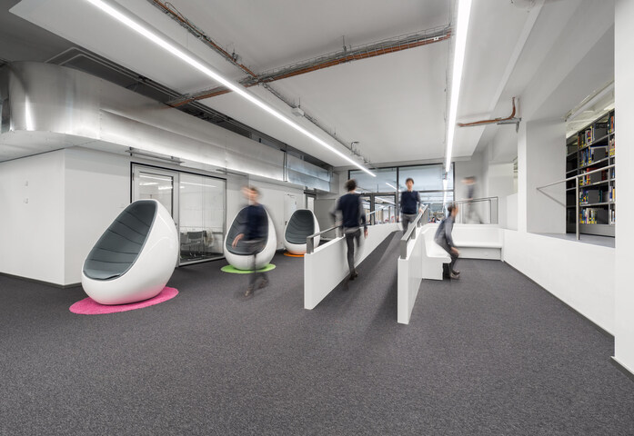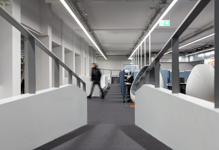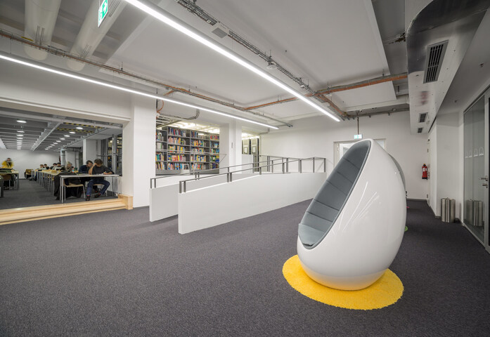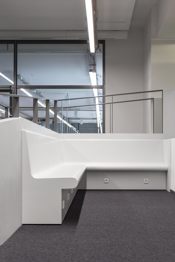 The project was designed and created by Staatlichen Bauamt München 2, one of the state construction companies whose work ranges from administrative buildings to the construction of laboratories, hospitals, research spaces, high schools, and university buildings with auditoriums, etc. The KRION solid surface was transformed for the library by the Schreinerei Josef Lagler workshop.