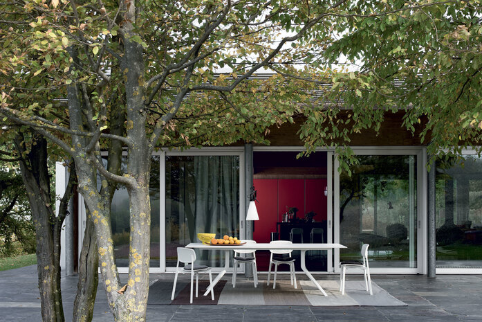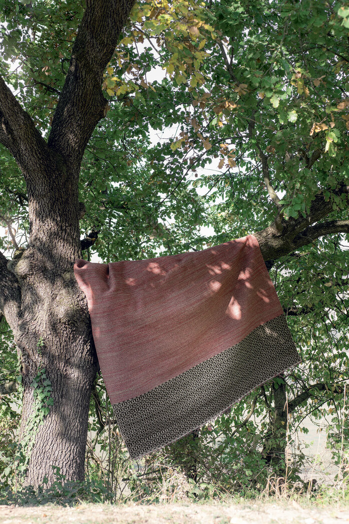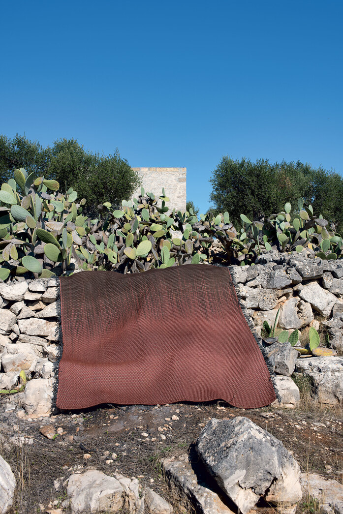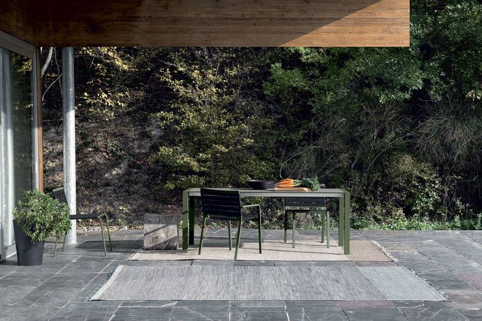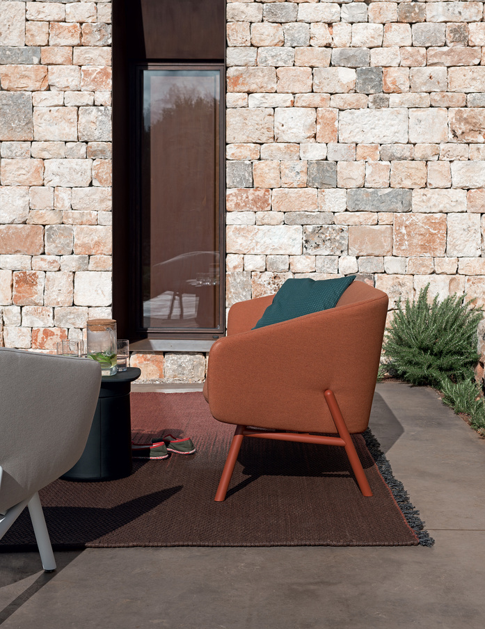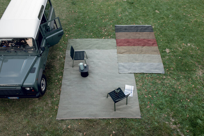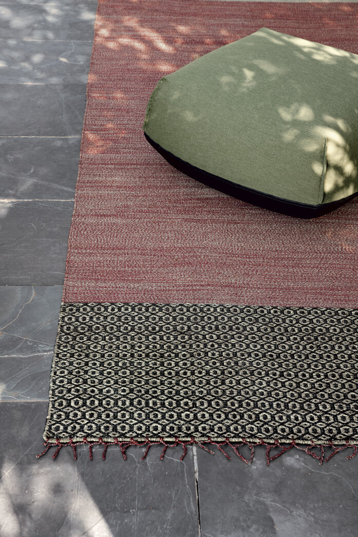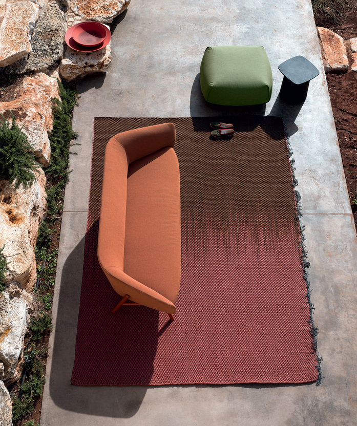 The philosophy of Mustache is to live problem-free outdoors with the same elegance that is a distinguishing feature of the most prestigious home and contract furnishing environments. A collection of carpets for outdoor spaces designed by Paolo Zani, featuring a melange weave in refined colours, with edge trims in various colours and unusual fringes that make them even more unique. With its prestigious craftsmanship and tailor-made quality, the handloom weaving technique makes each one of these carpets slightly different and therefore unique. Since it has draining and quick-drying properties, polypropylene fibre yarn is ideal not only for outdoor environments, where it is resistant to weather conditions and its colours are not affected by UV rays, but also for indoor environments such as pools, saunas and hammams (places with high levels of humidity). Mustache carpets are made of high-quality polypropylene yarns, ideal for both indoor and outdoor use. The only precaution required is to use non-slip mesh if the floor is very smooth.