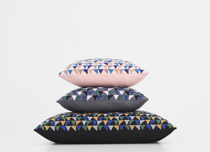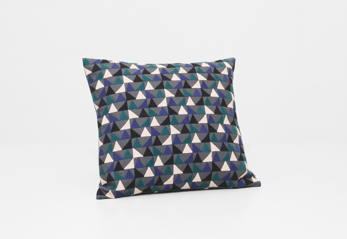 Botany features four differently coloured triangles, on a base of Forest Nap, an upholstery textile designed by Akira Minagawa. These playful forms are reminiscent of abstract leafs or the sails of ships dancing on the horizon. The cushion comes in colourful and understated colourways.