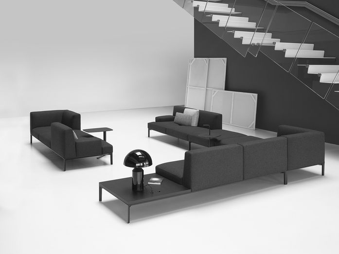 After having analyzed a particular niche of the contract market which, especially in some geographic areas, was in need for generous seating, the project of widening the range of ADD was born, also becoming an alternative for the home interior.The idea is the same: a modular system with aluminium extruded frames powder coated, linked together by die-cast aluminium legs, and elastic belts for more comfort.