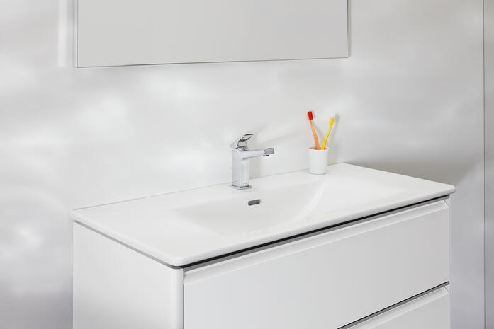 The Palace Slim Packs have now been added to the Palace family. Each package contains a 45 cm deep combination of a 60, 80 or 100 cm-wide Palace washbasin and a matching vanity unit from the Base furniture collection.