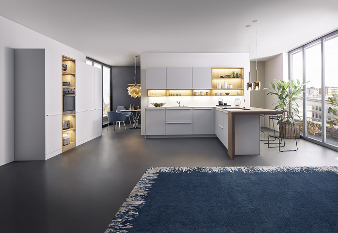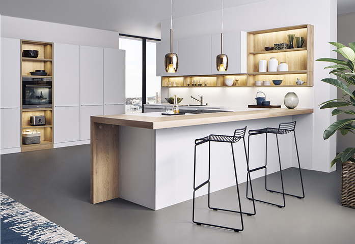 The bright white with a delicate hint of grey elegantly harmonises with the finely structured oak and lends this open room plan a harmonious air. The shelves and open compartments underline the pleasant homeliness – the side panel table, which is joined to the island at the same height, looks just as homely and inviting.