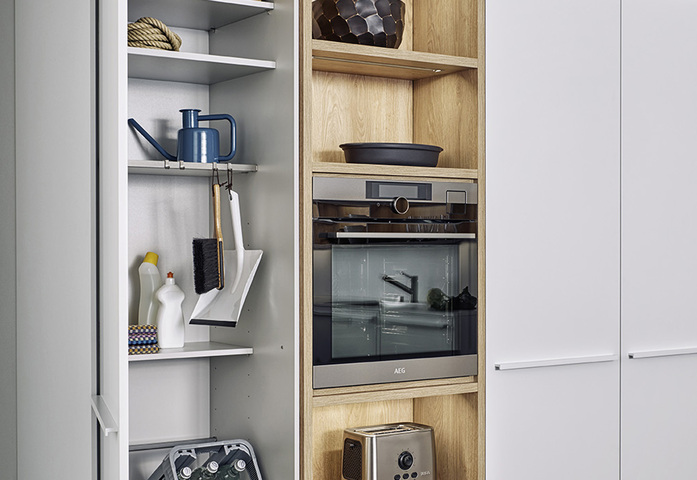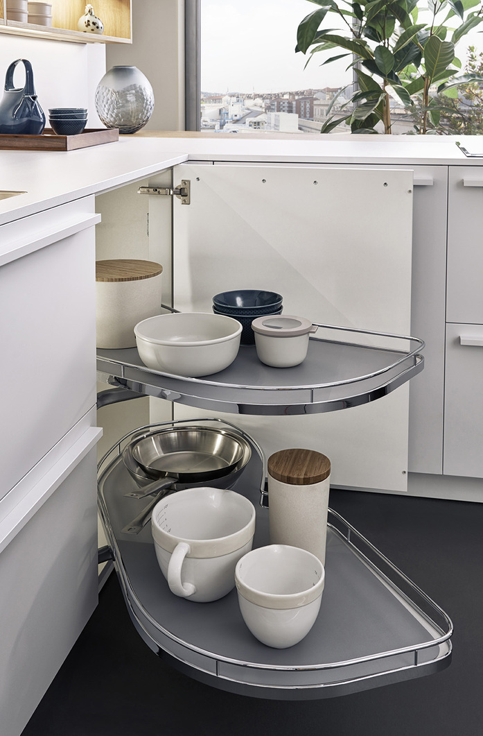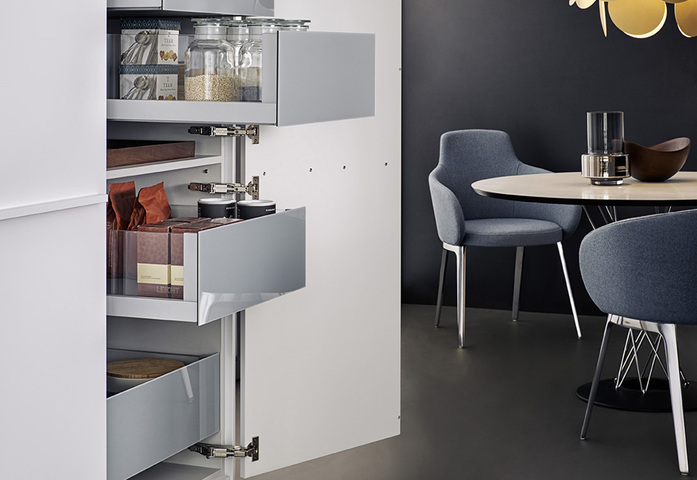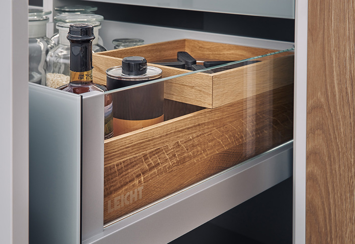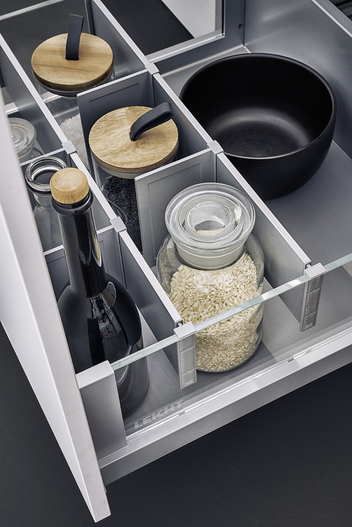Behind what appear to be very calm fronts, there is a world of storage space and the finest organisation systems. LEICHT has developed special new storage space for crates of drinks. This ensures that bulky crates are quickly stowed away in the right place and are nevertheless easily accessible when you need to pour drinks. The system offers great variability too – not just for one but for several creates of different sizes.