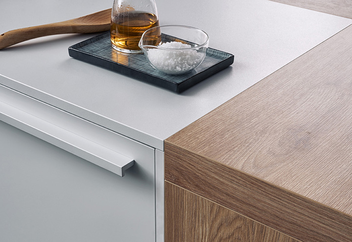The perfect kitchen for compact and open planning – homely and casual with plenty of storage space. Even the island with the characteristic side panel table was orchestrated down to the very last detail: it integrates the hob, structures the room and serves as a bar; a relaxing seating area even for several people in the middle of the living area.