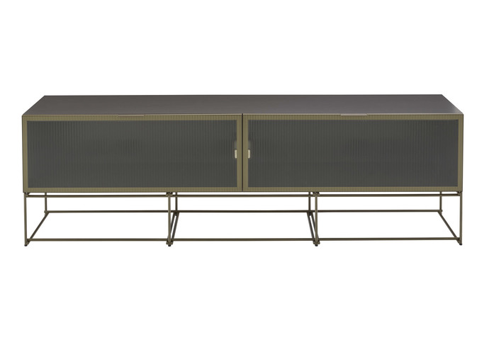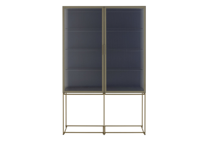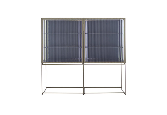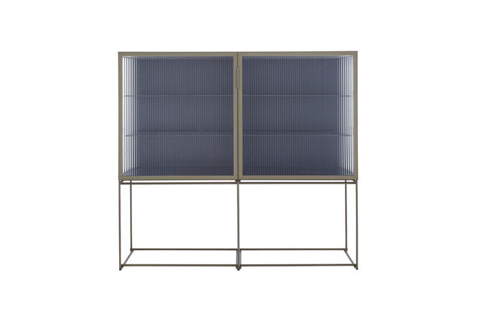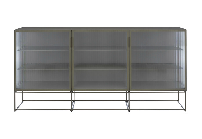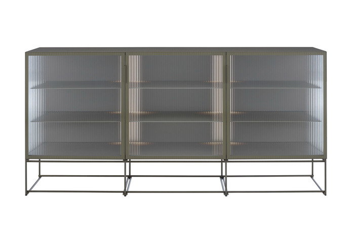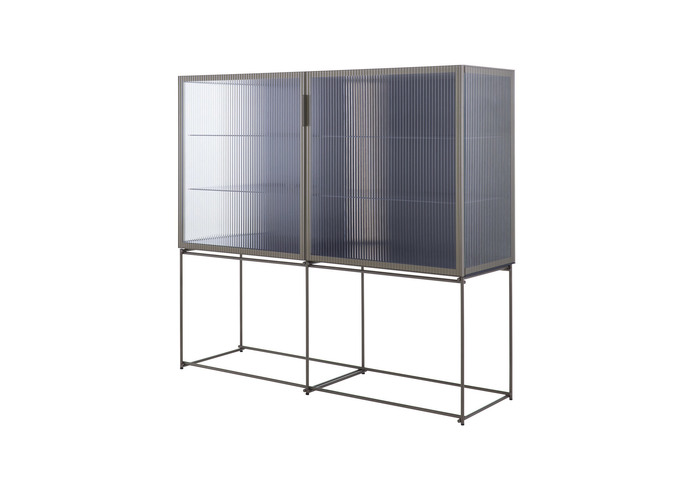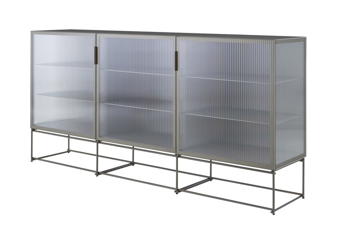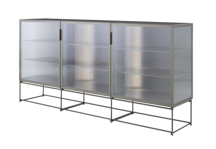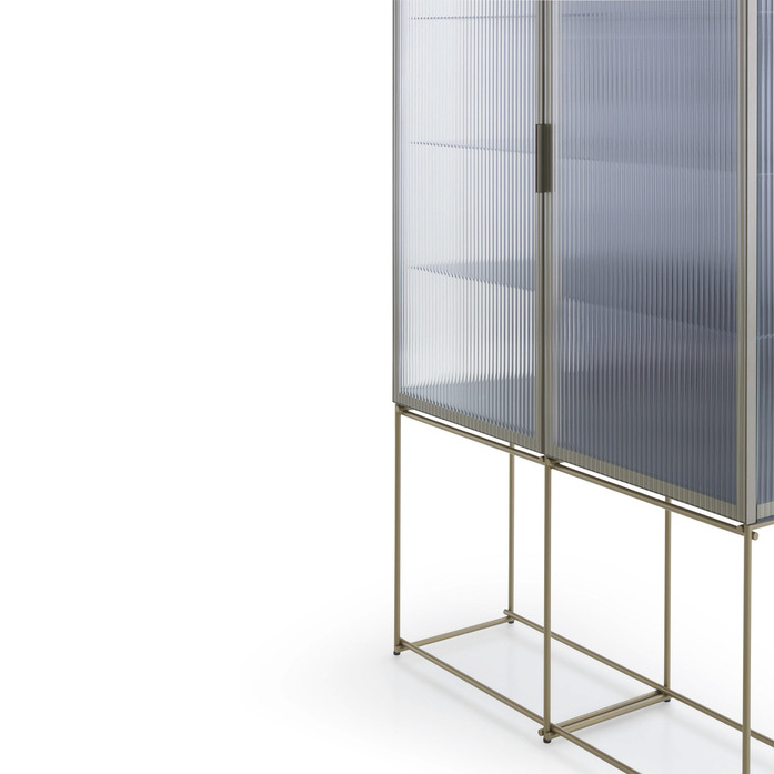 The CANALETTO collection of glazed units is a small but very singular range. The upper section is completely glazed, both front and sides, with a ridged glass with a widely-spaced linear pattern, an alternation of dips like peaks and troughs. This slim glass lets one see, or least guess at, the outlines of the objects held within, as the light plays across it. The glass of the doors is mounted flush with the smoked, brushed anodised aluminium frames, held in place by invisible glue beneath a bronze martingale.