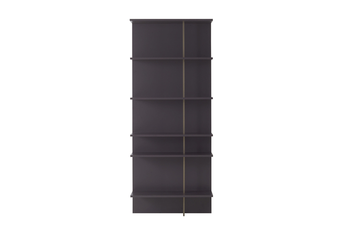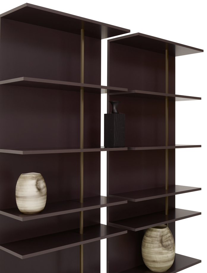 Its sobriety is announced by the monochrome appearance of the back panel and shelves, but the imagination behind it is expressed by the presence of the bronze-coloured main stem and then echoed by the handles.