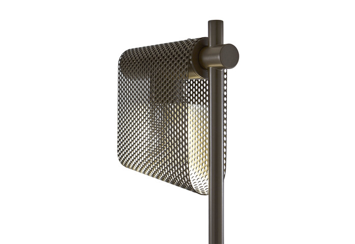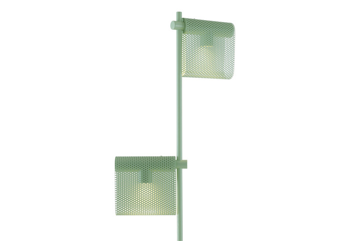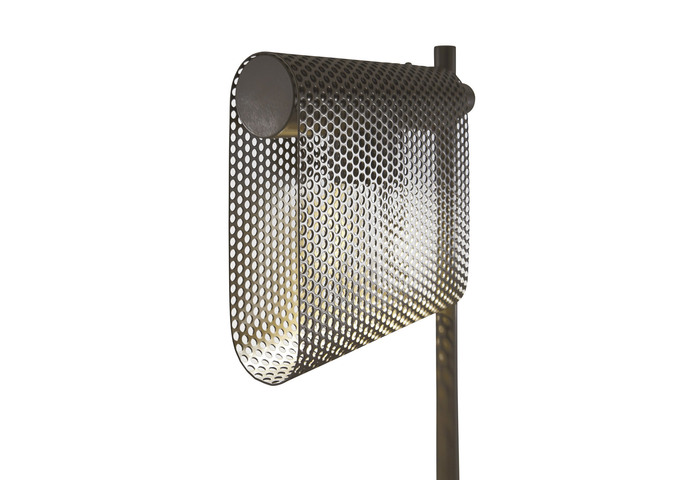 Floor lamp – Rectangular base with rounded corners, dimensions 35 x 28 cm. / Metal stem in tubularsteel, Ø 22 mm. The 2 shades in rolled, soldered perforated sheet metal are fixed to the stem at heights120 cm and 175 cm from the ground. / Dimensions of shades : 30 x 5.5 cm H 28 cm. / Finished in Epoxysatin green or bronze lacquer. / Black textile cable with black foot-operated switch. /2 x 5 W GU10dichroic full glass LED bulbs, beam angle 36°, colour temperature 3,000K (warm white), 400 Lumens ;ECL-approved. / Energy class A+ / Compatible with bulbs of energy classes E to A++.