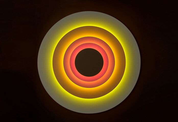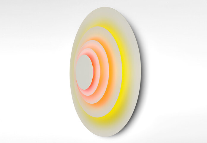 Concentric is a visually striking lamp whether it’s on or off, though turned on in the dark is when it becomes the most impressive and dynamic. The effect it promotes is almost hypnotic, because of the way the light vibrates when we view it. Concentric’s design emerges from the observation of a natural phenomenon: while on an airplane journey, the fixture’s designer noticed the effect of the sunlight entering through the windows and reflecting the vibrant colours of the passengers’ clothing on the curved white surface of the airplane’s interior. The Concentric collection is based on an artistic endeavour to highlight this interaction between light and the reflection of colour, as each white circular panel plays with a different colour on its back. In daylight, these colours are subtly perceived, but at night when the lamp is on is when they come to the fore and shine, stirring complex coloured light effects. Because of its pure symmetrical shape, Concentric plays with these reminiscences of the sun. It comes in three different sizes and three different colour combinations: the Corona model with neon colours, the Major model with warm colours, and the Minor model with cool colours.