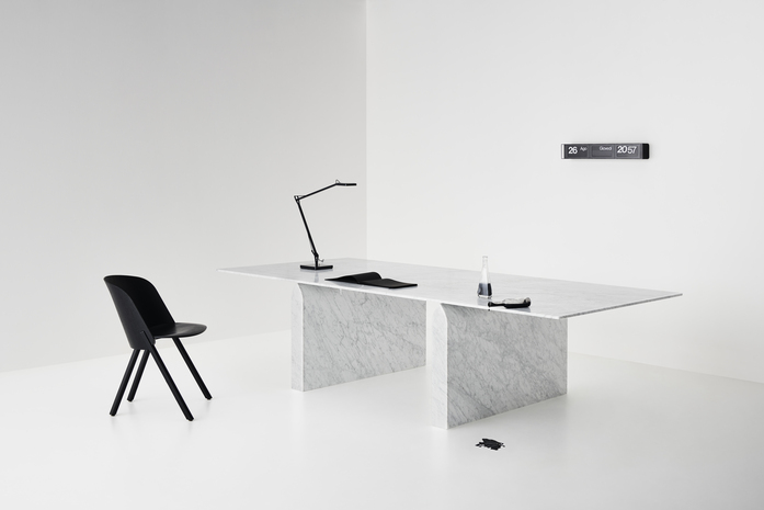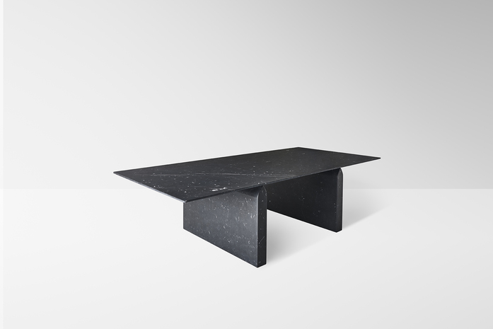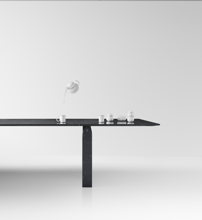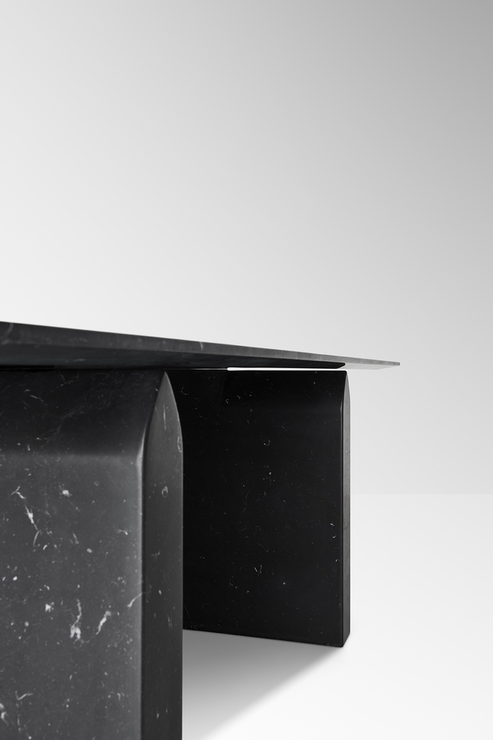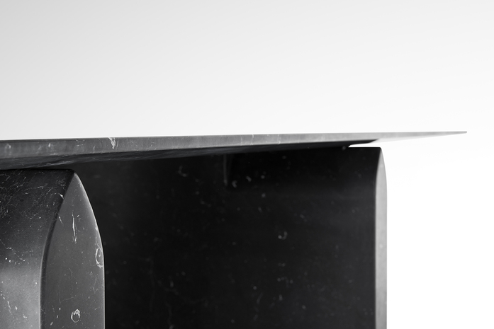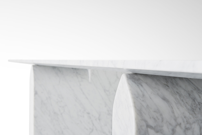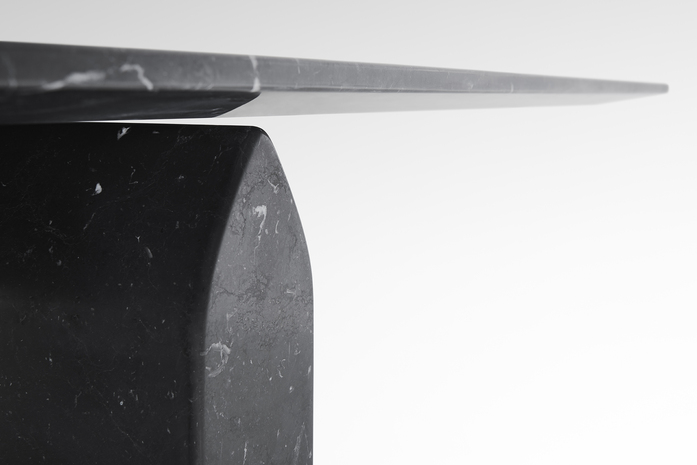 The original solid shape of the marble base in contrast with the lightness of the table top which seems to softly raise up from the base.