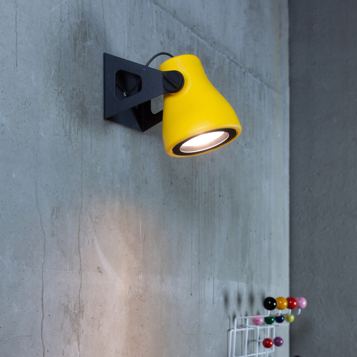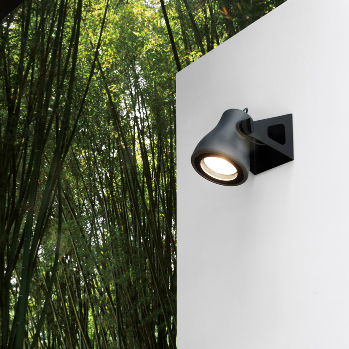 Outdoor lamp with adjustable direct light. With black painted aluminium base. Body lamp moulded in polyethylene with rotational technology in octane blue, yellow or black colour. For Led bulb. A peg is available to fix the lamp in the lawn.