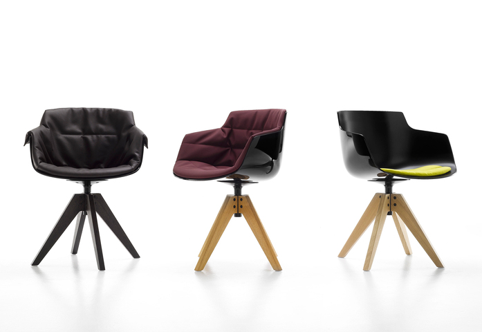 A family of seating of great impact and comfort. Options: with a white or black polycarbonate shell - with a padded or padded XL shell. Base options: 4-legged, sled, 4-legged steel, 4-legged LEM, 5-point-star height-adjustable on castors, 5 point-star fi xed, central leg, VN 4-legged oak, 4-legged oak. Optional upholstered PAD.