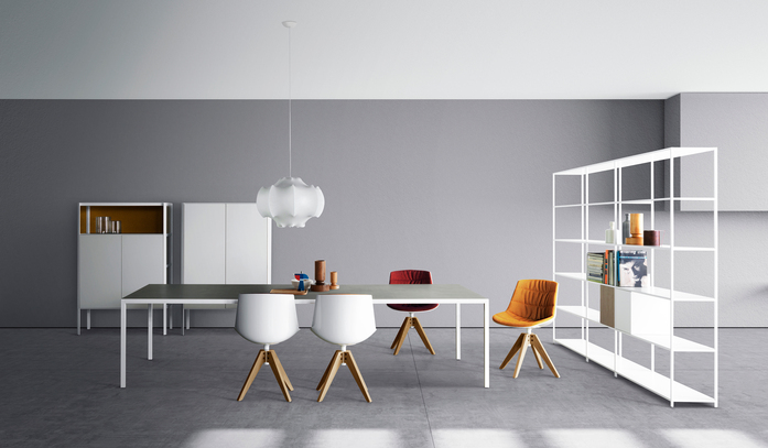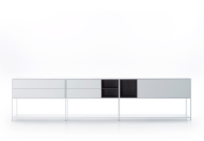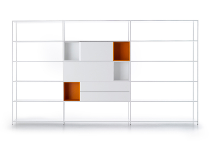 Minima 3.0 represents the natural makeover of Minima, MDF Italia collection's icon product. The storage units (with door, flap opening door, drawers, or open) are simply resting inside the structure and are repositionable quite easily. Uprights and shelves made of matt lacquered white and graphite grey extruded aluminium. Nominal lengths of cabinets: 30, 60, 90 cm, height 35 cm and depth 33 cm. Available in a matt lacquered micro-goffered finish or in a wood variant. Two options: free-standing (in 6 heights) or hanging (in 4 heights), always with a 33 cm depth.