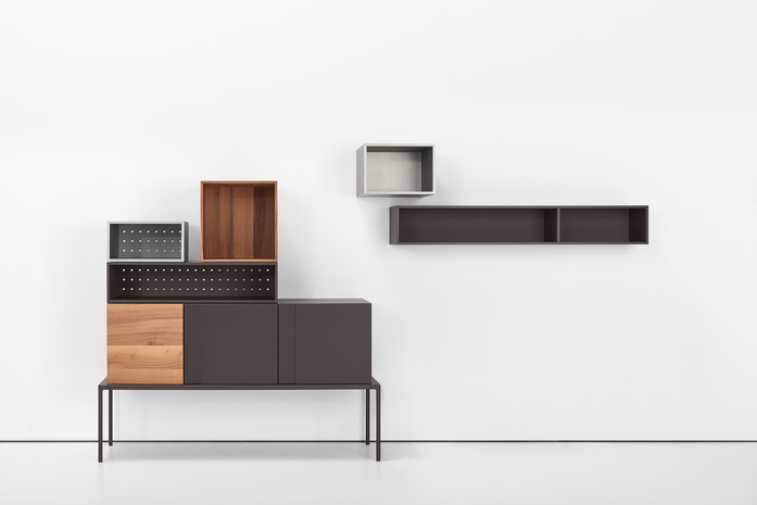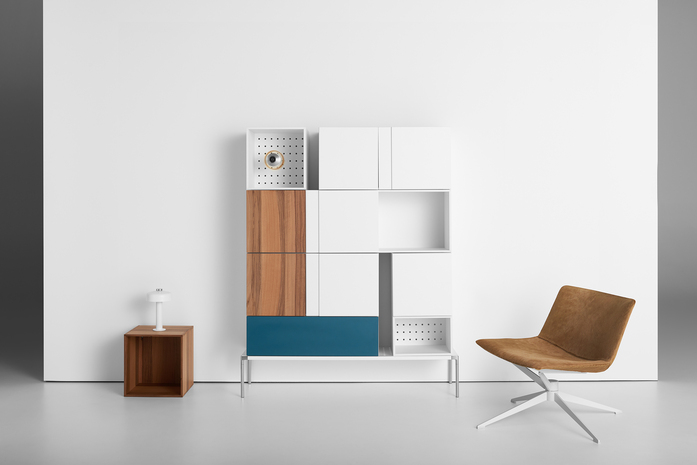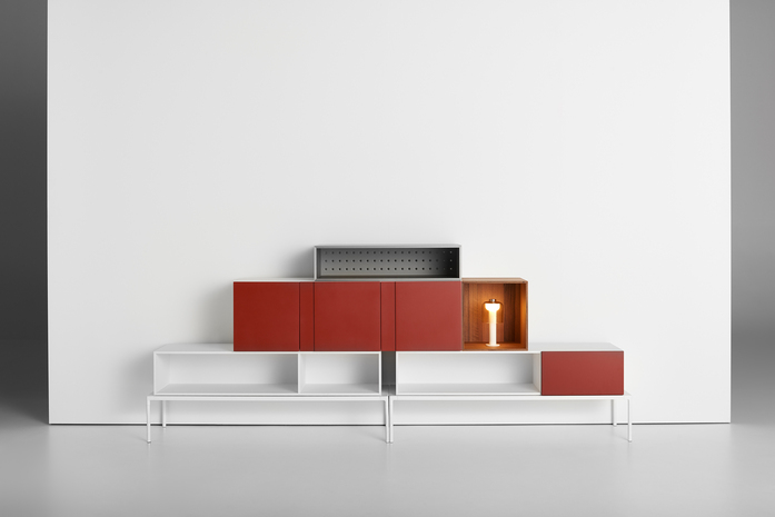 A perforated panel is the base for numerous compositions and acts as a visual link amongthe composing parts. Adapting to new and different environments, Quark features a few units to more complexschemes, reinventing its characteristics through a wide choice of colors and finishes.