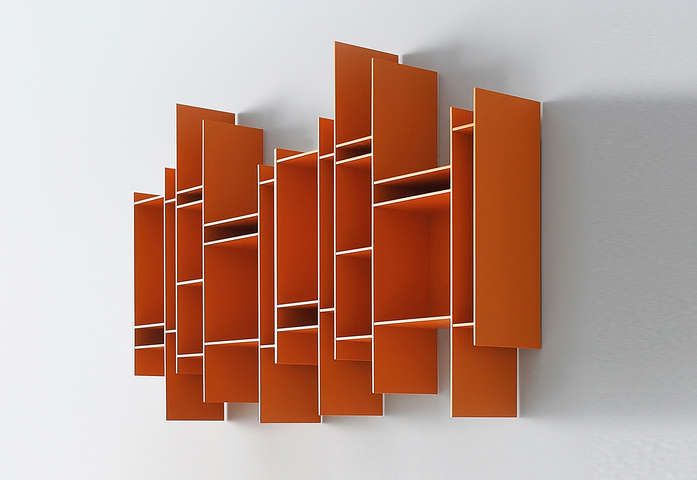 A small hanging bookcase made of wood fibreboards, in micro-goffered white lacquer. Uprights and shelves in thickness 6mm; back made from white melamine-coated board. The unit, which can be turned upside down, acts individually as an attractive graphic mark on the wall. By aggregation, flanking or staggering more elements, large-sized dynamic configurations give rise to a wall stunning architectonic element.