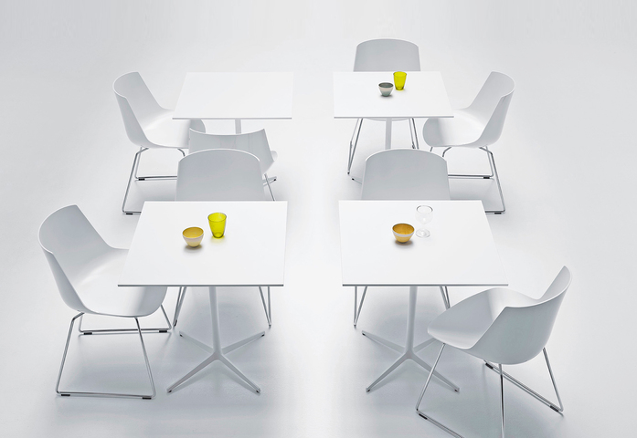 Coffee table with a steel central leg and a 4-point-star base from cast aluminium painted in matt white or graphite grey. The tops are made of: